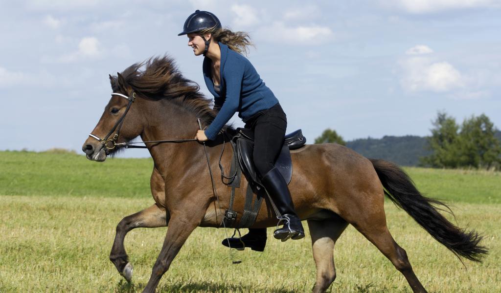 Обои Молодая девушка в шлеме скачет на коричневой лошади