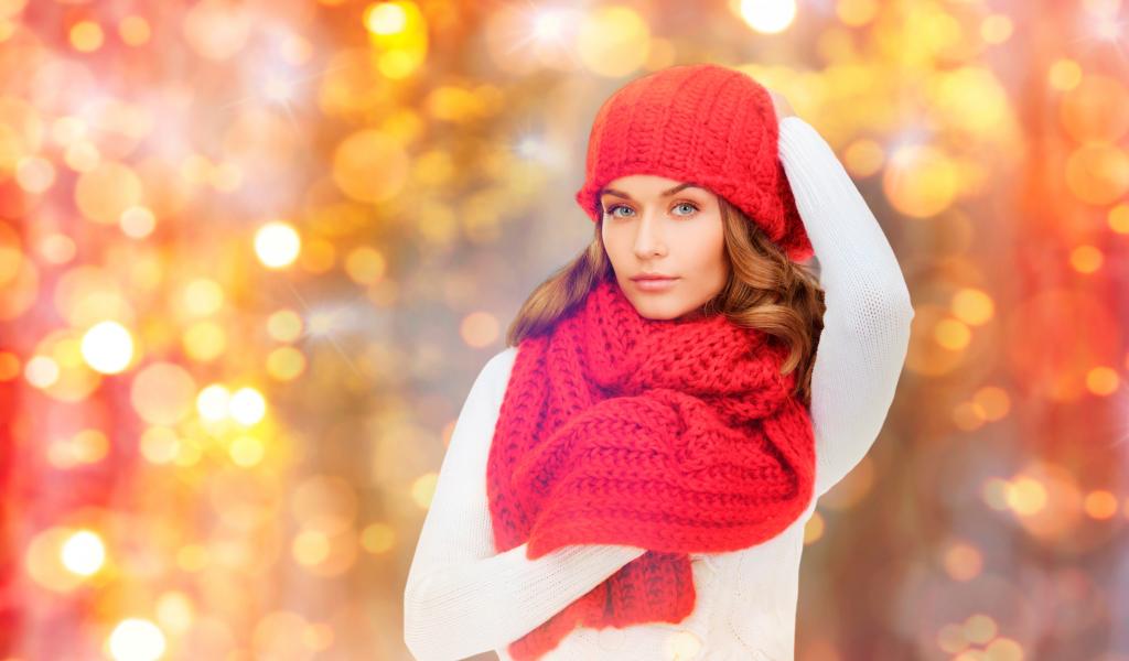 Обои Красивая молодая девушка в красной шапке с шарфом