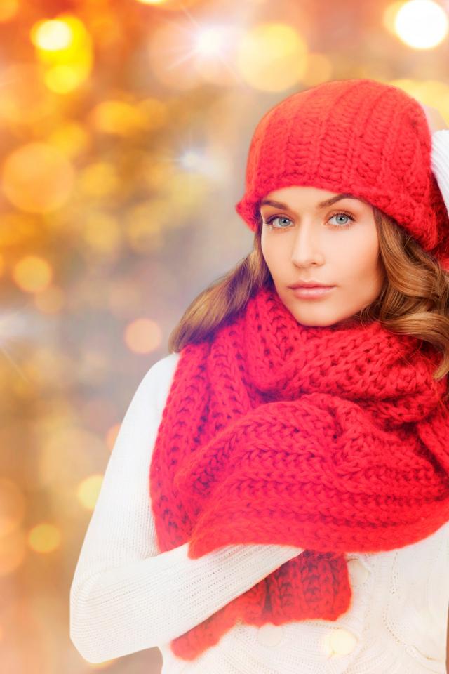 Обои Красивая молодая девушка в красной шапке с шарфом