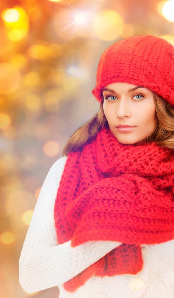 Обои Красивая молодая девушка в красной шапке с шарфом