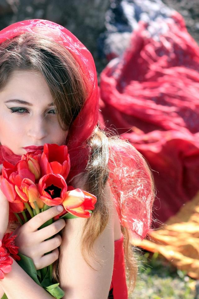 Обои Красивая девушка в красной шали с букетом тюльпанов