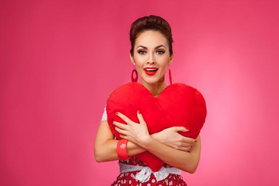 Обои Счастливая девушка с большим красным сердцем на розовом фоне