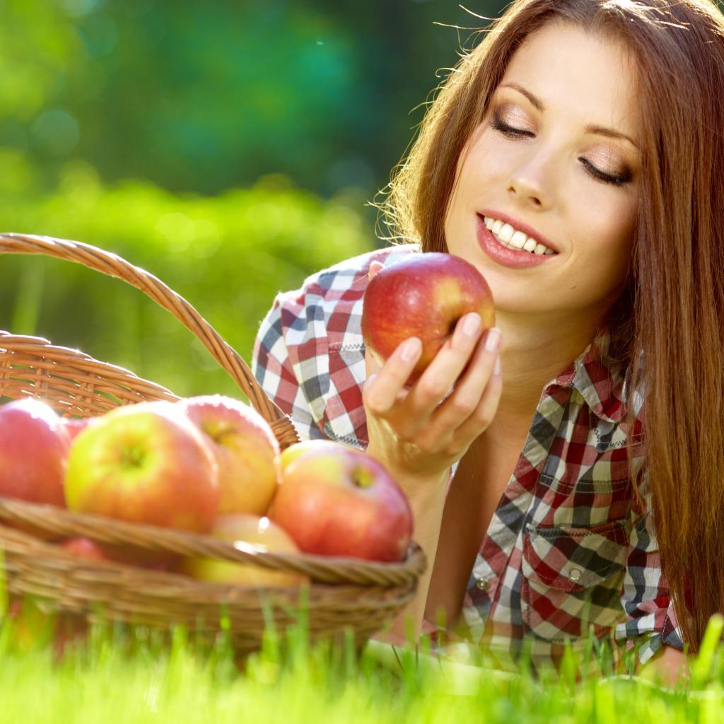 Обои Красивая улыбающаяся девушка с корзиной красных яблок