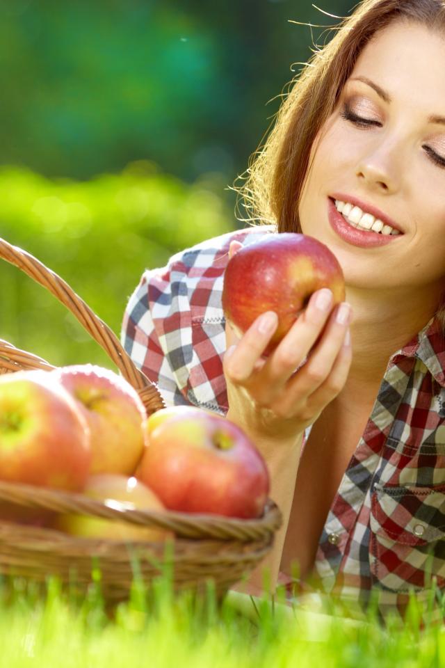 Обои Красивая улыбающаяся девушка с корзиной красных яблок