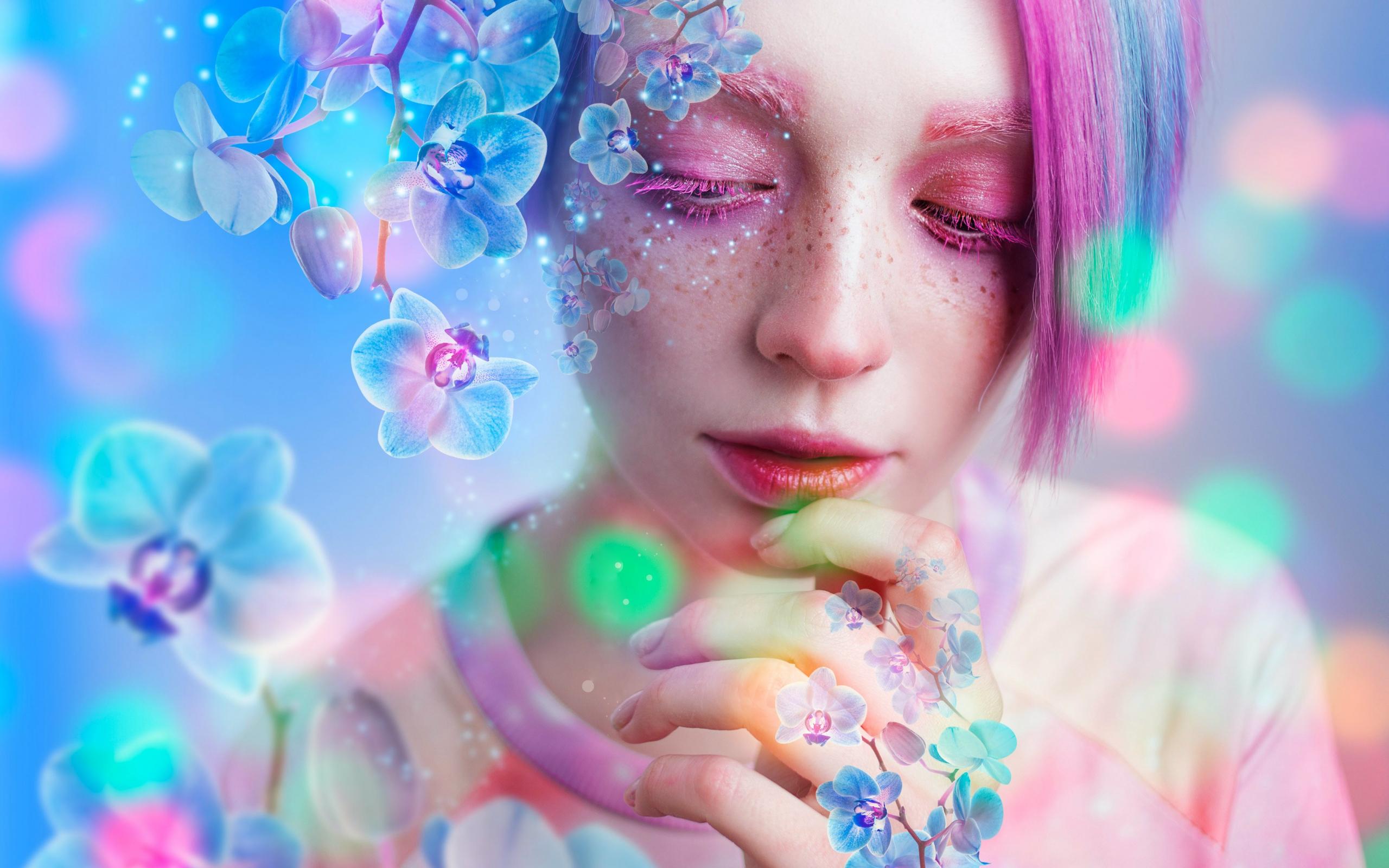 Обои Молодая девушка с розовым макияжем в окружении цветов