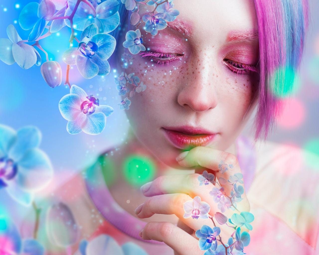 Обои Молодая девушка с розовым макияжем в окружении цветов