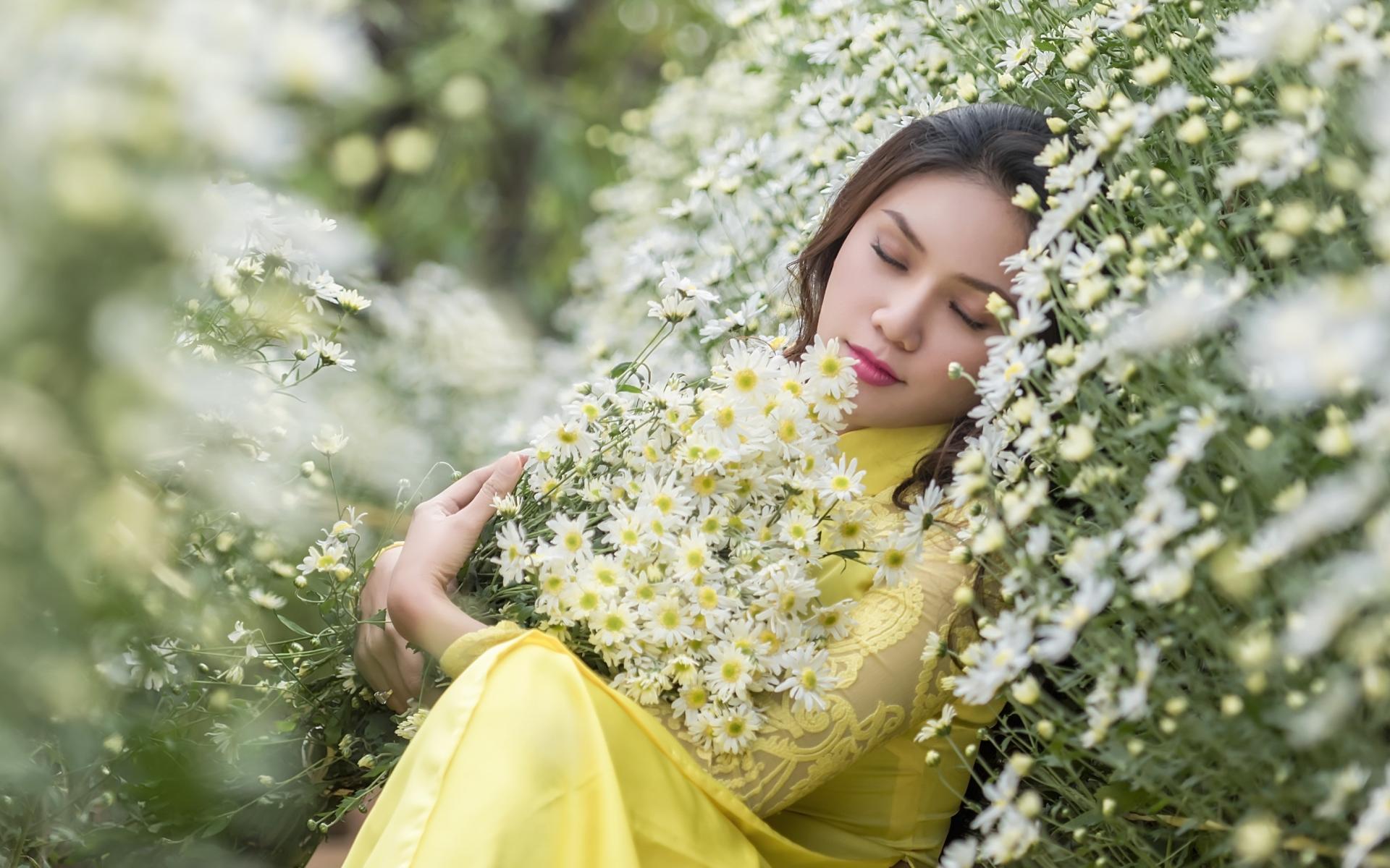 Обои Молодая девушка лежит с букетом белых ромашек