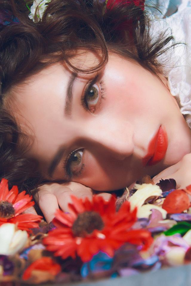 Обои Молодая красивая девушка лежит цветами в волосах
