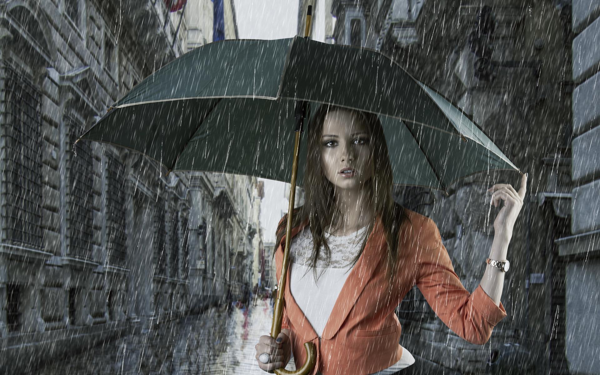 Обои Молодая девушка с зонтом под дождем