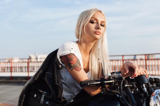 Обои Брутальная блондинка с татуировкой на руке на мотоцикле