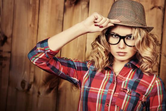 Обои Красивая блондинка в рубашке, очках и шляпе