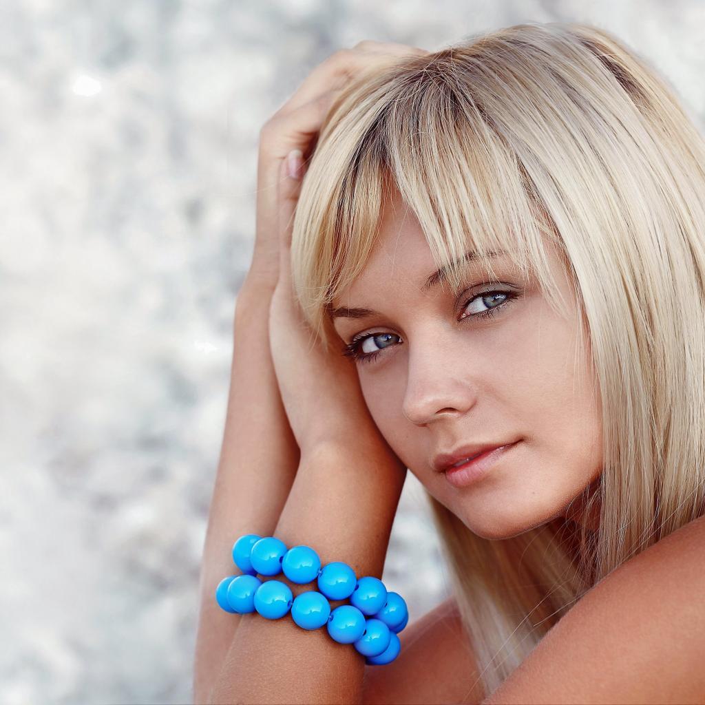 Обои Красивая блондинка с большим голубым браслетом на руке