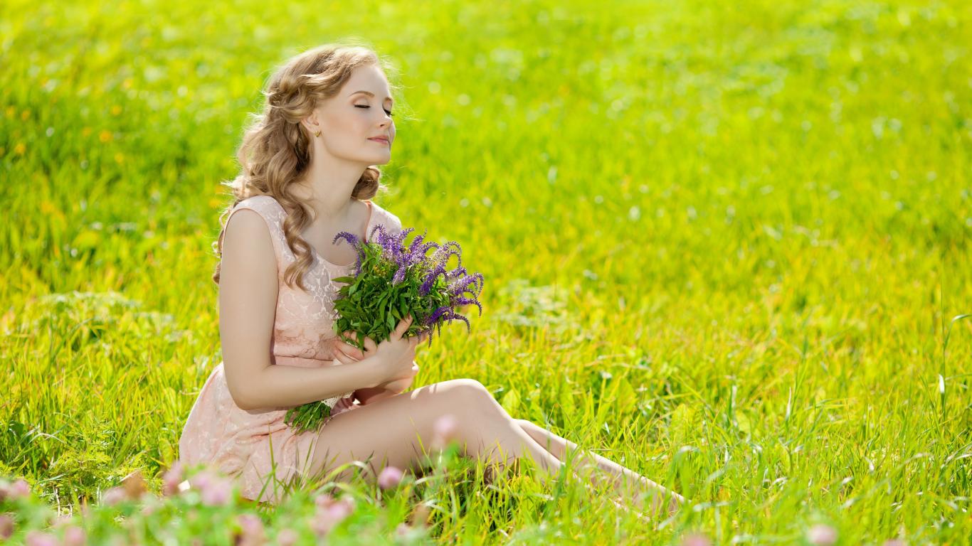 Обои Красивая девушка с букетом сидит на зеленой траве
