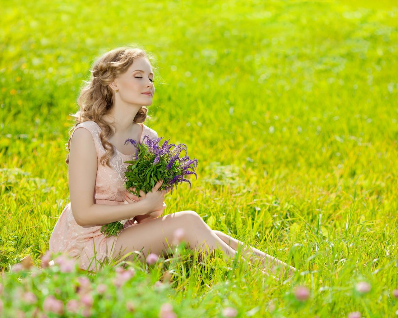 Обои Красивая девушка с букетом сидит на зеленой траве