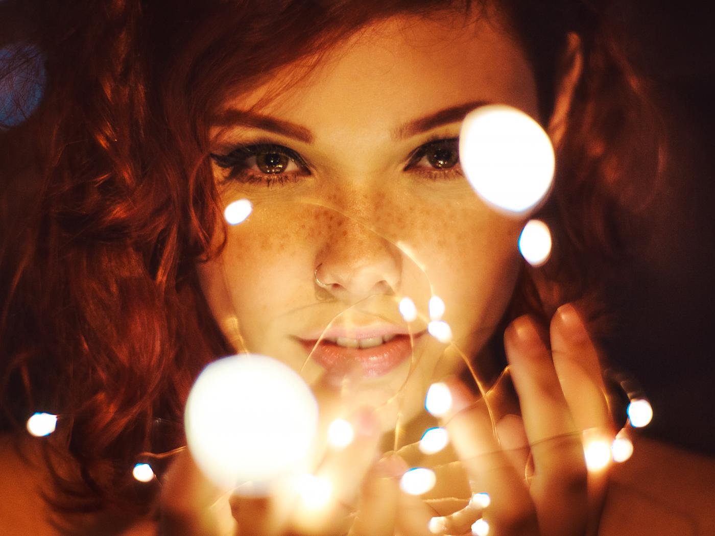 Обои Красивая рыжеволосая девушка с гирляндой в руках