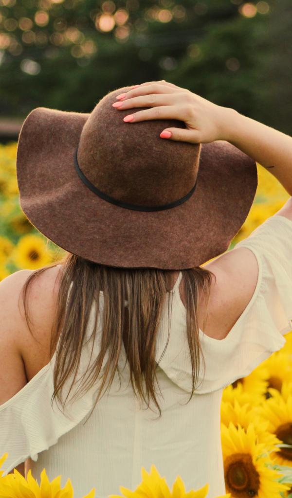 Обои Молодая девушка в большой шляпе на поле с подсолнухами