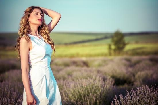 Обои Красивая девушка в белом платье на лавандовом поле