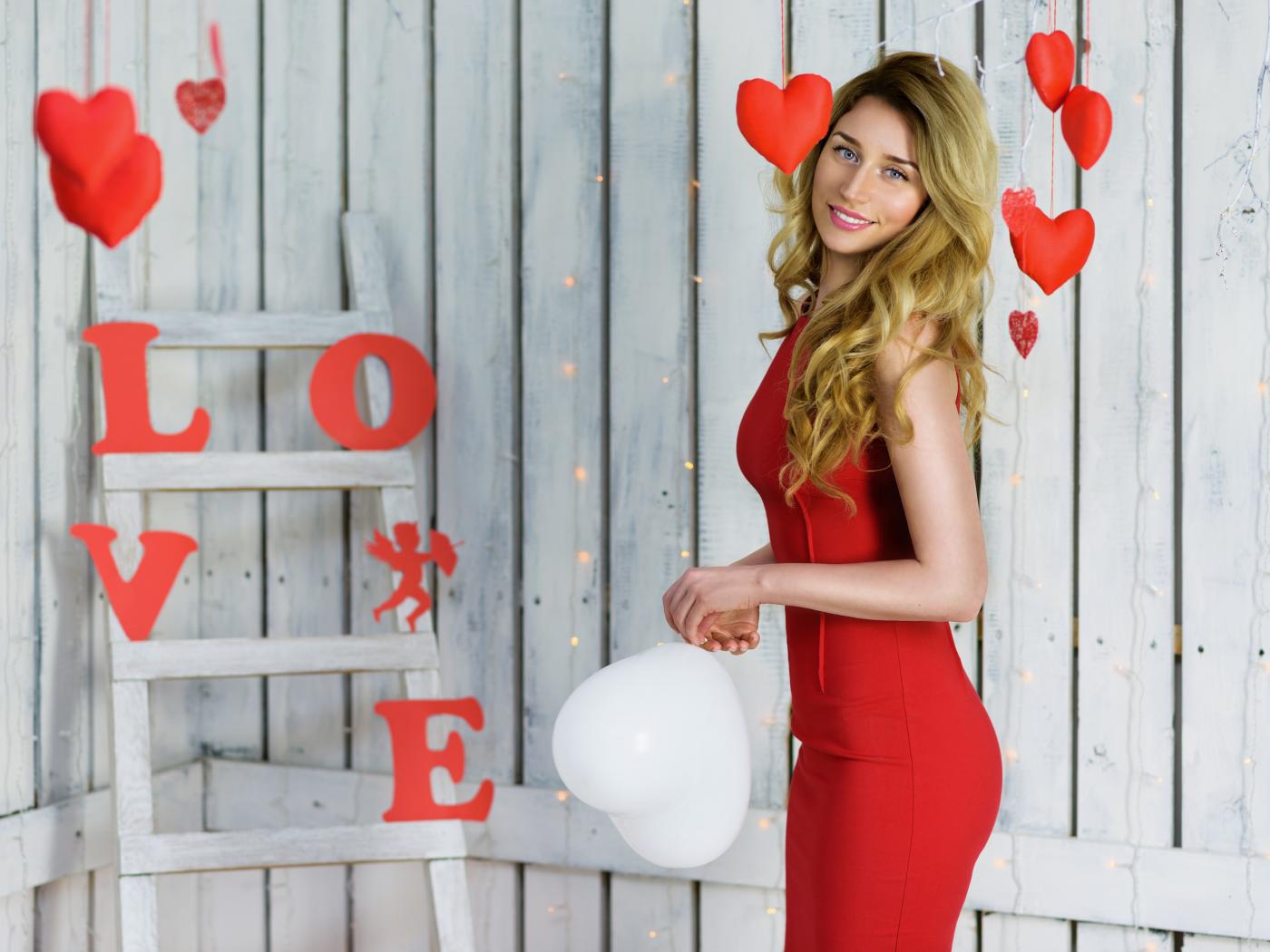Обои Красивая блондинка в красном платье с шариком