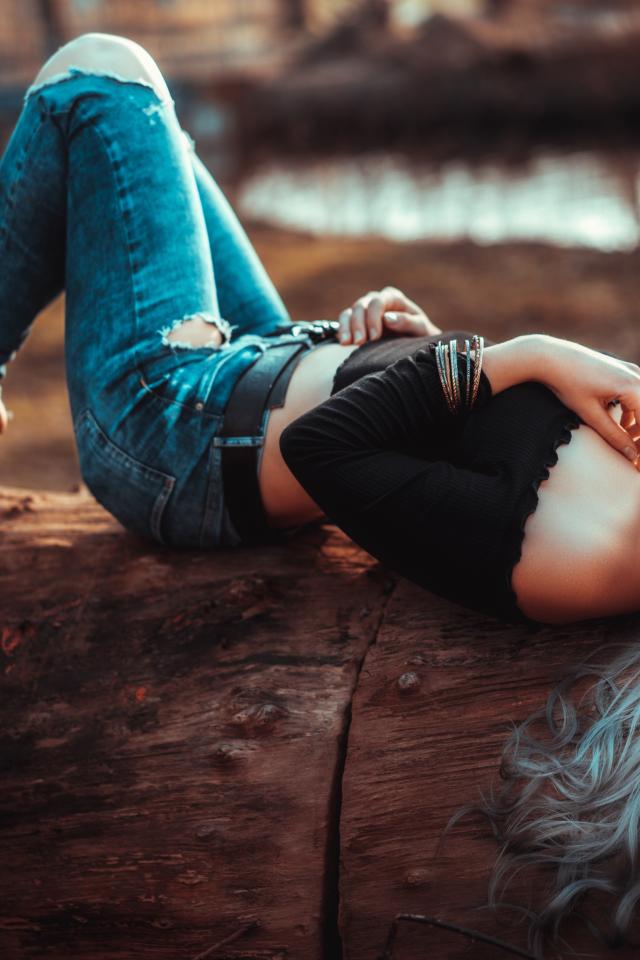 Обои Красивая молодая блондинка лежит на сухом дереве