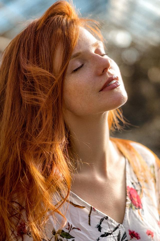 Обои Красивая рыжеволосая девушка нежится в лучах солнца