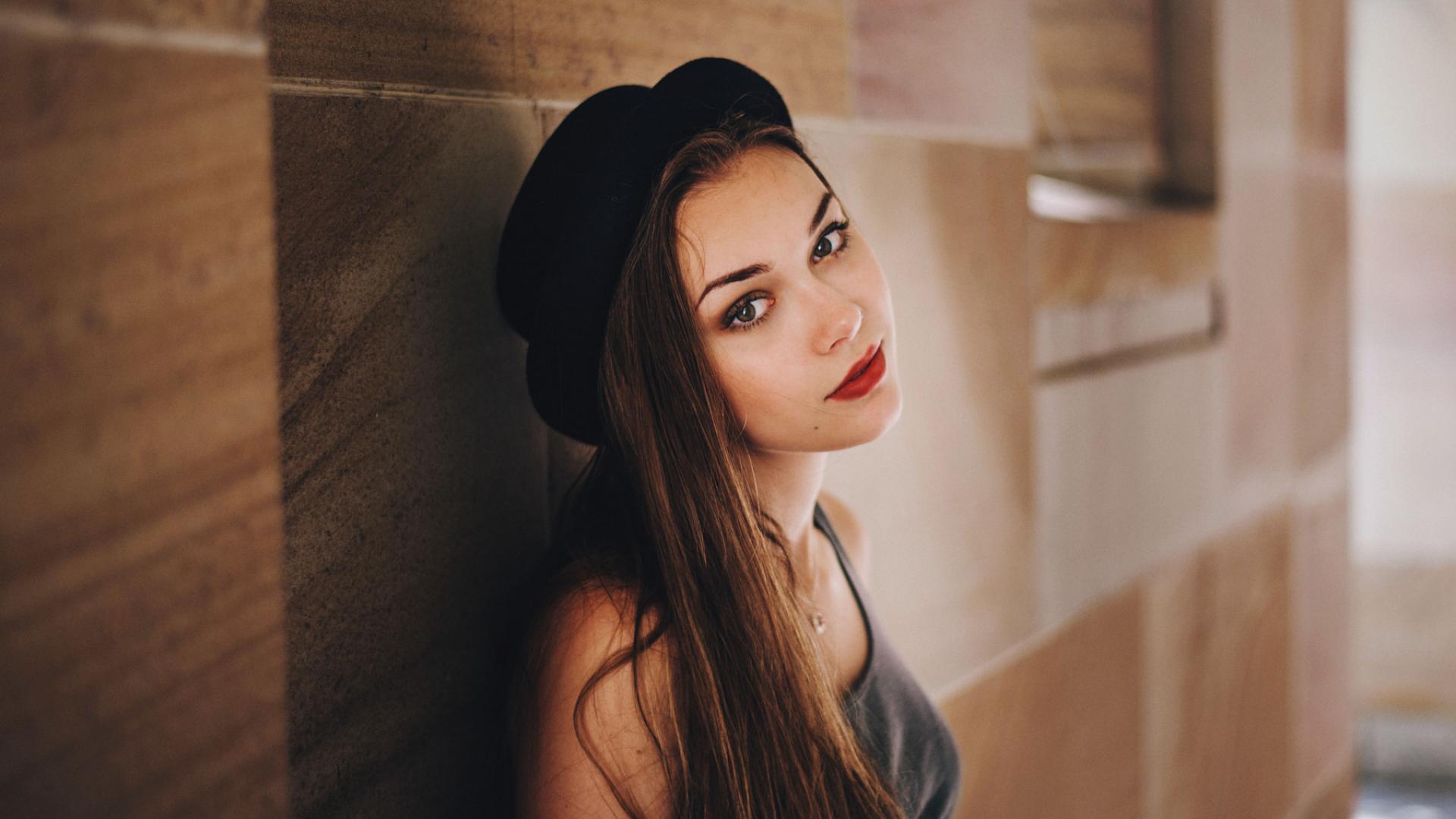 Обои Красивая девушка в черной шляпе у стены