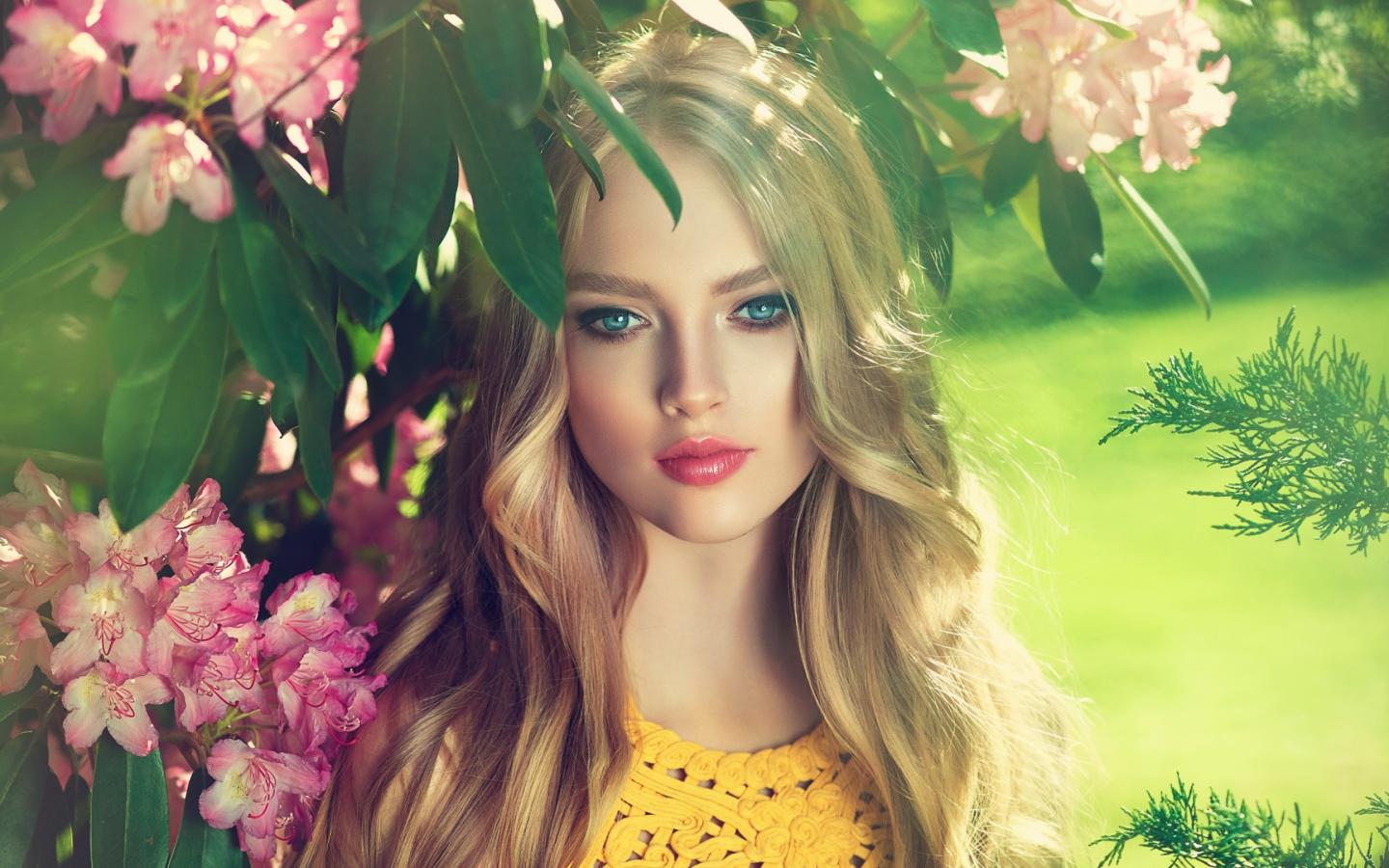 Обои Нежная голубоглазая блондинка в розовых цветах