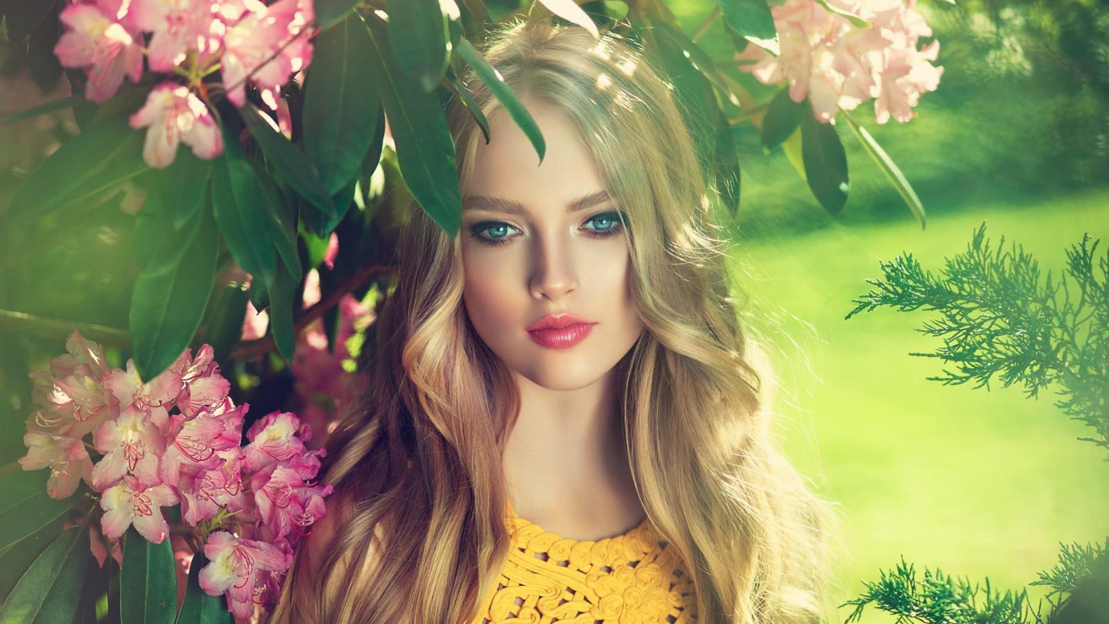 Обои Нежная голубоглазая блондинка в розовых цветах