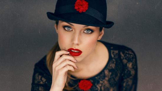Обои Стильная девушка с ярким макияжем в черной шляпе