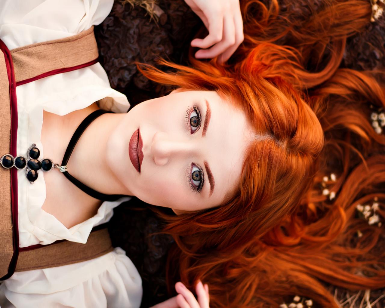 Обои Красивая рыжеволосая девушка лежит на земле