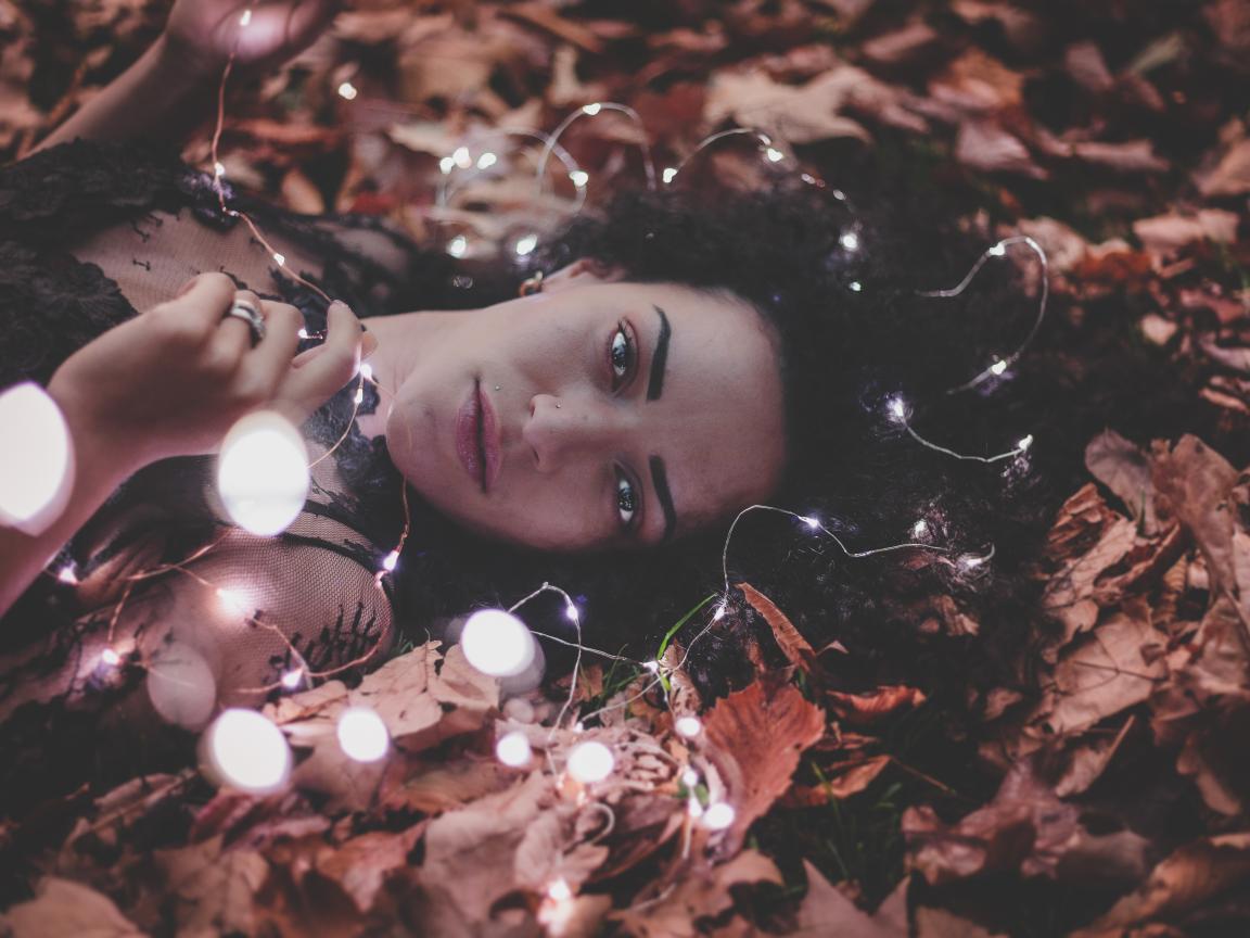 Обои Молодая девушка лежит с гирляндой на желтых листьях