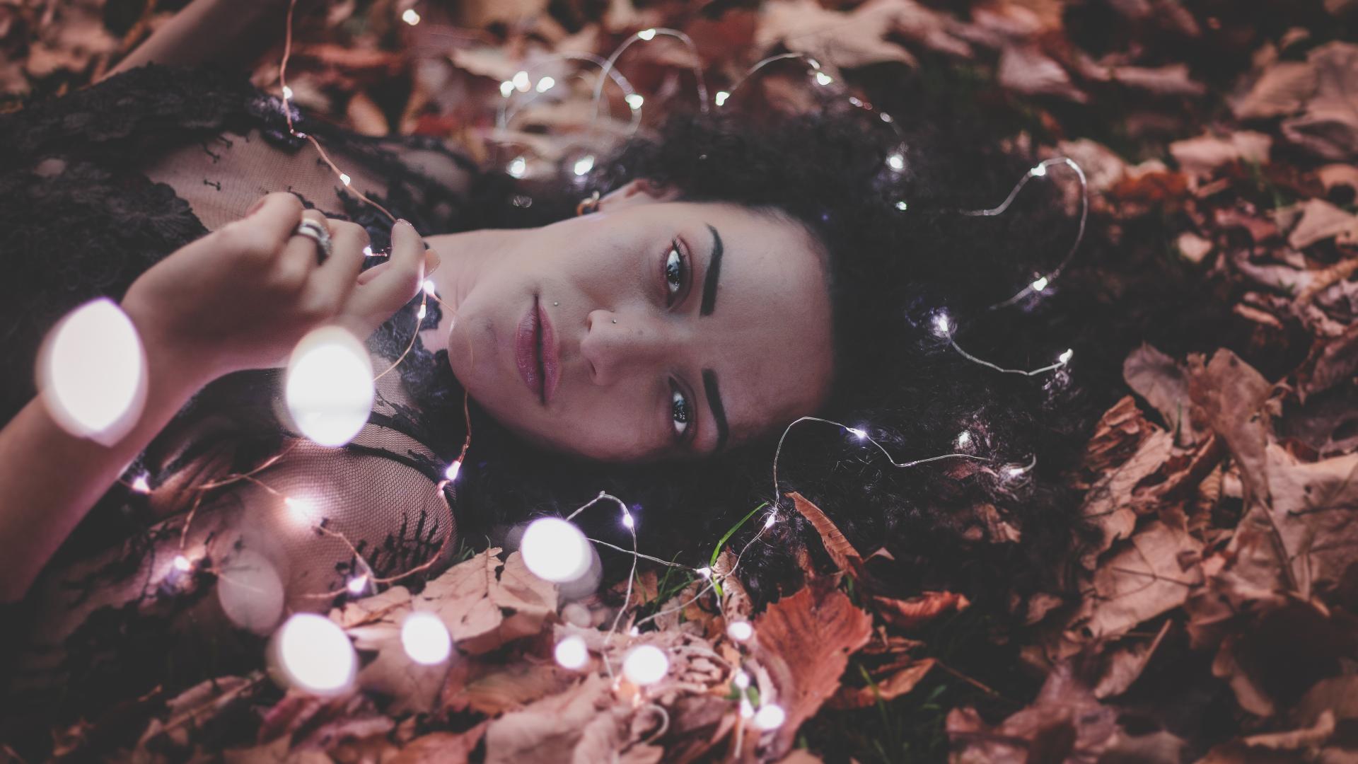 Обои Молодая девушка лежит с гирляндой на желтых листьях