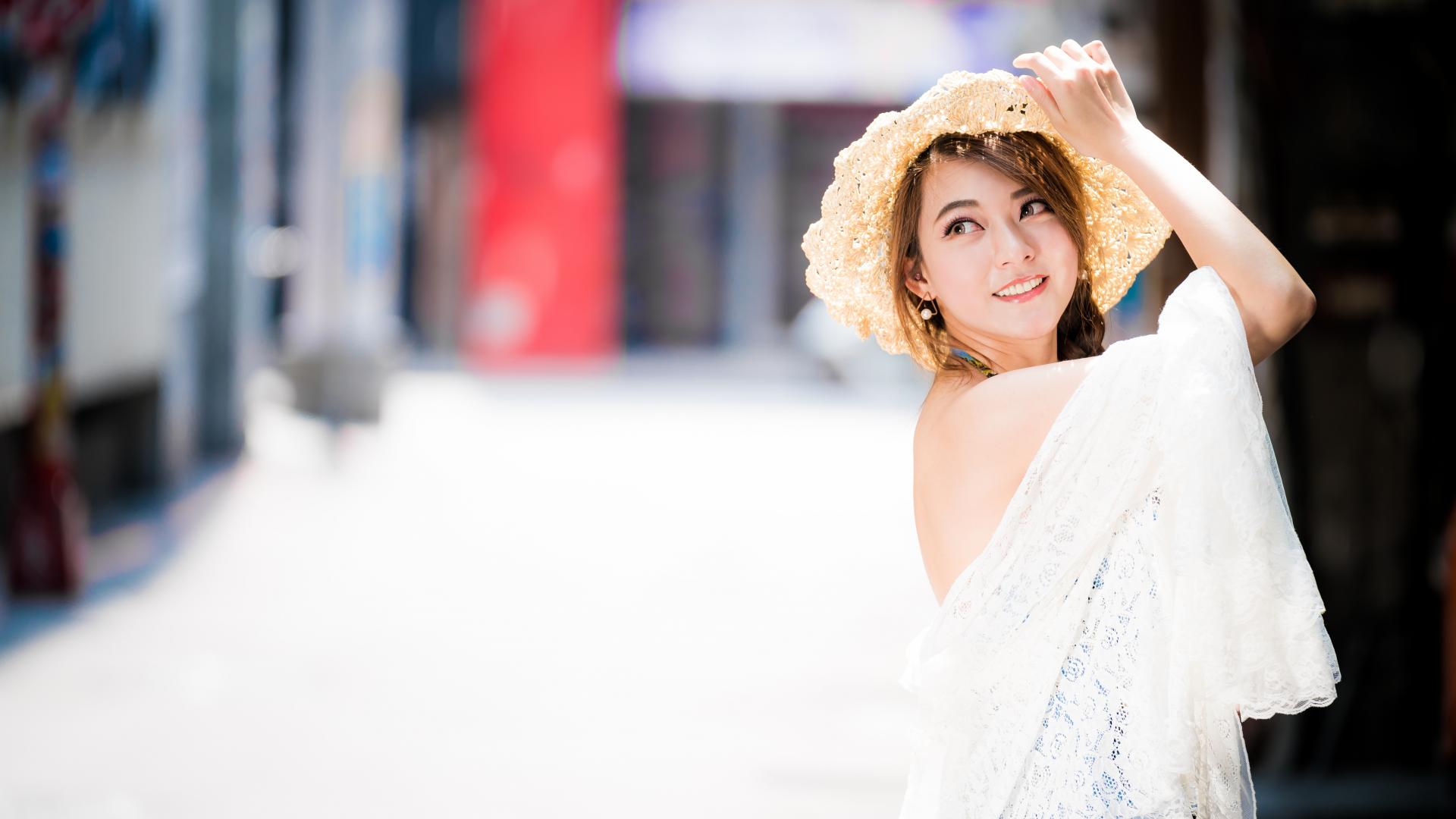 Обои Азиатская девушка в белой кружевной шляпке