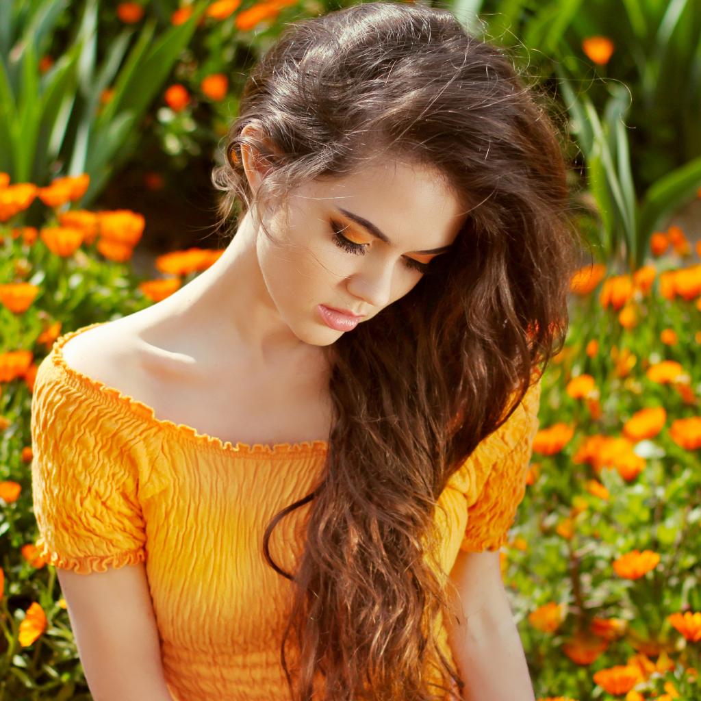 Обои Красивая девушка у цветов календулы