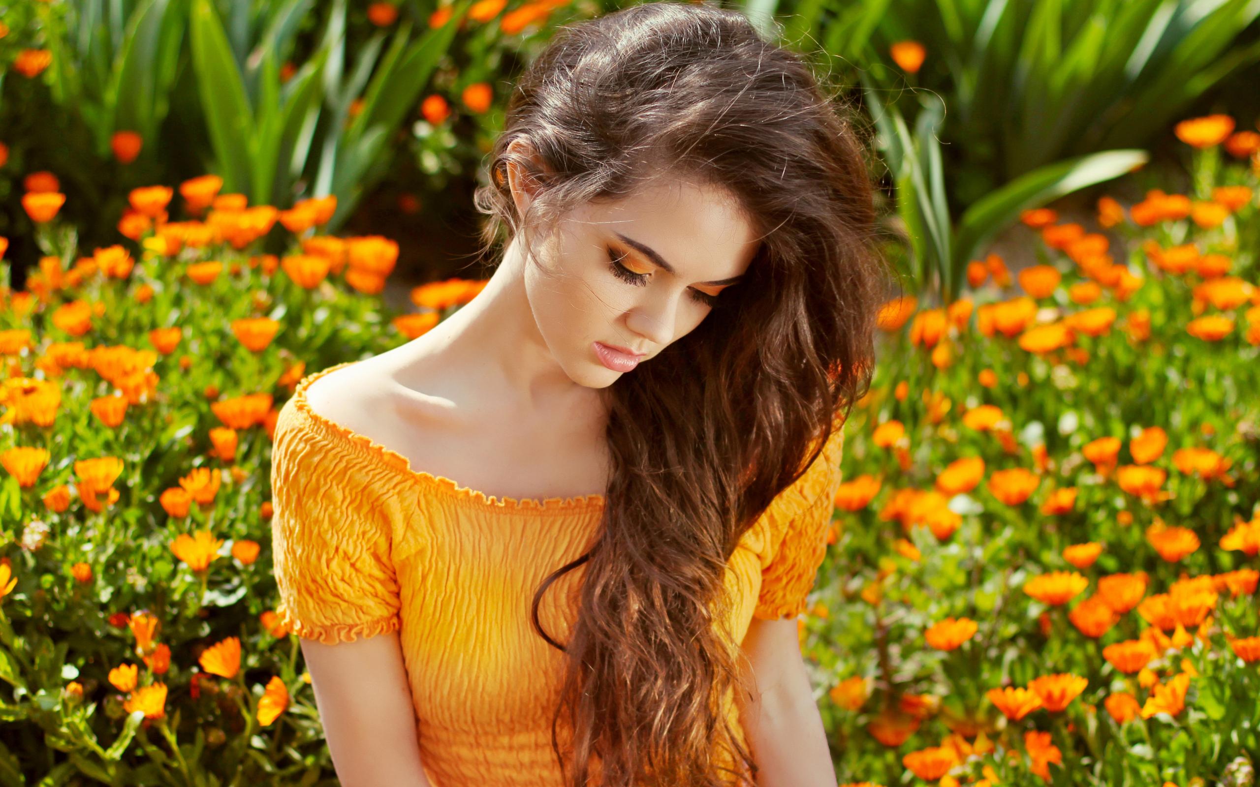 Обои Красивая девушка у цветов календулы
