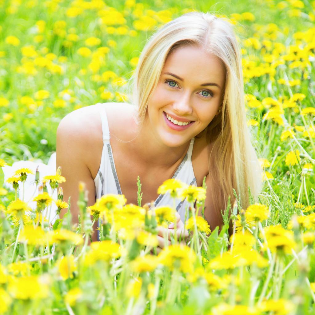 Обои Красивая улыбающаяся блондинка в желтых одуванчиках