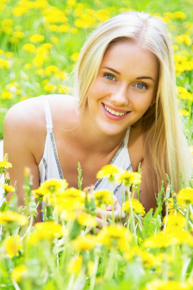 Обои Красивая улыбающаяся блондинка в желтых одуванчиках