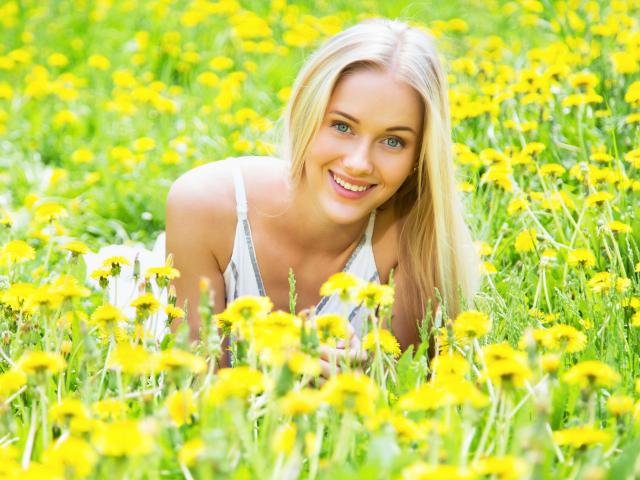 Обои Красивая улыбающаяся блондинка в желтых одуванчиках