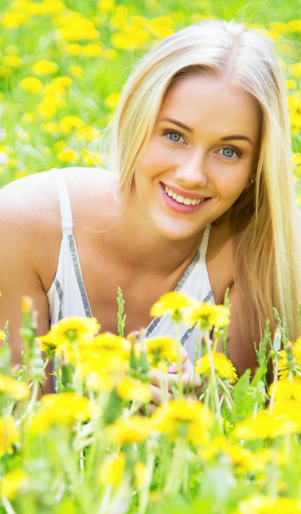 Обои Красивая улыбающаяся блондинка в желтых одуванчиках