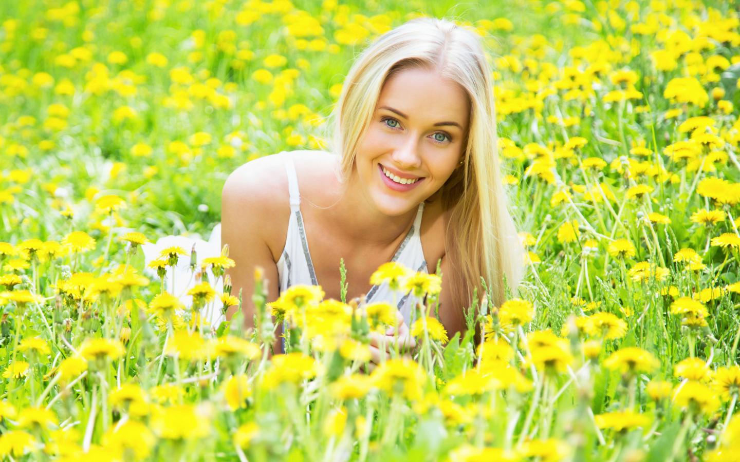 Обои Красивая улыбающаяся блондинка в желтых одуванчиках
