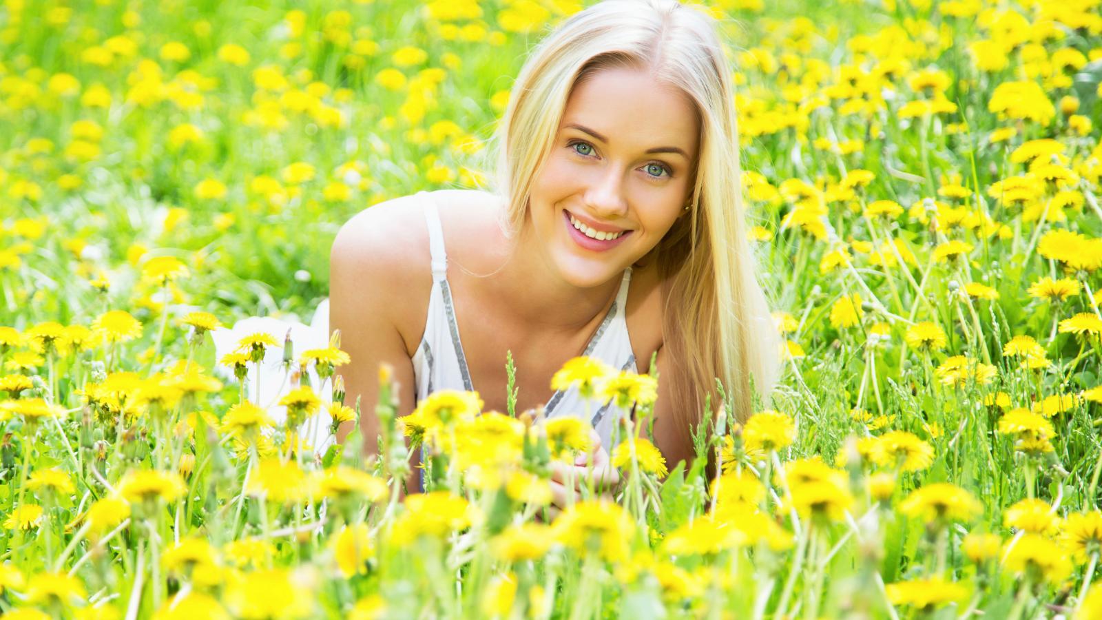 Обои Красивая улыбающаяся блондинка в желтых одуванчиках