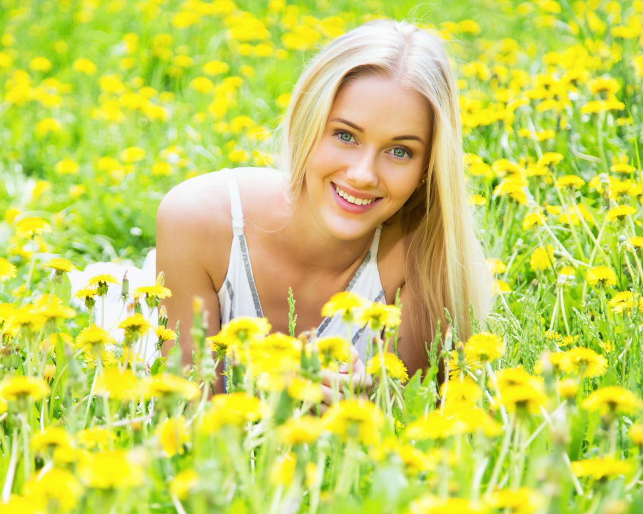 Обои Красивая улыбающаяся блондинка в желтых одуванчиках
