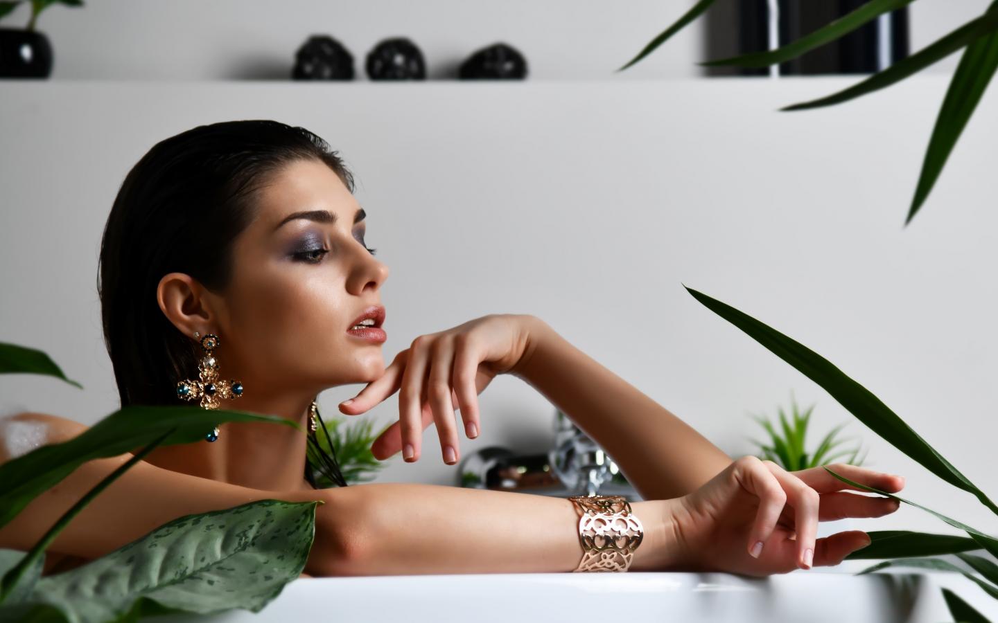 Обои Девушка в дорогих украшения лежит в ванной