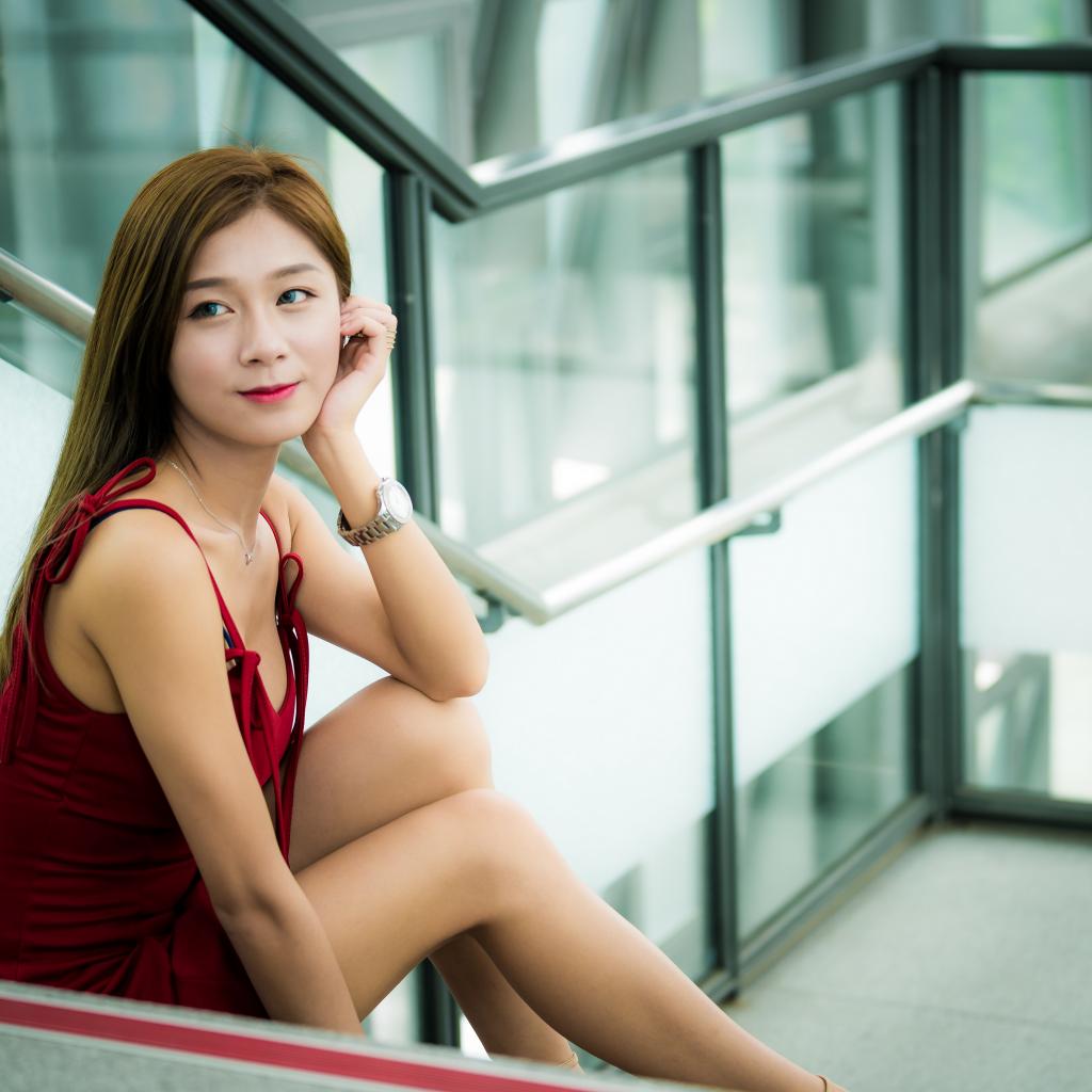Обои Красивая молодая девушка азиатка сидит на ступенях