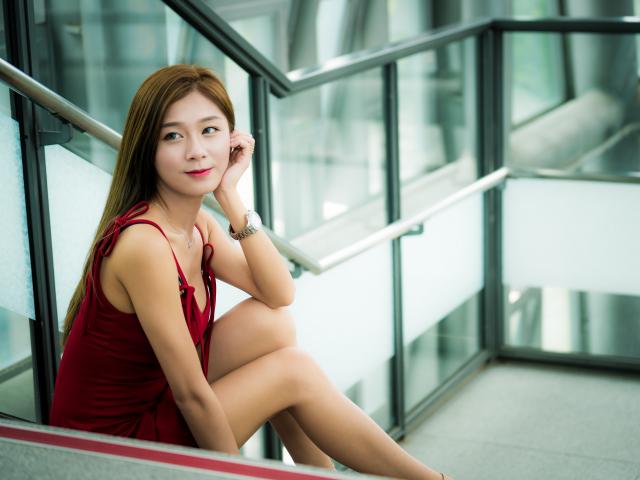 Обои Красивая молодая девушка азиатка сидит на ступенях