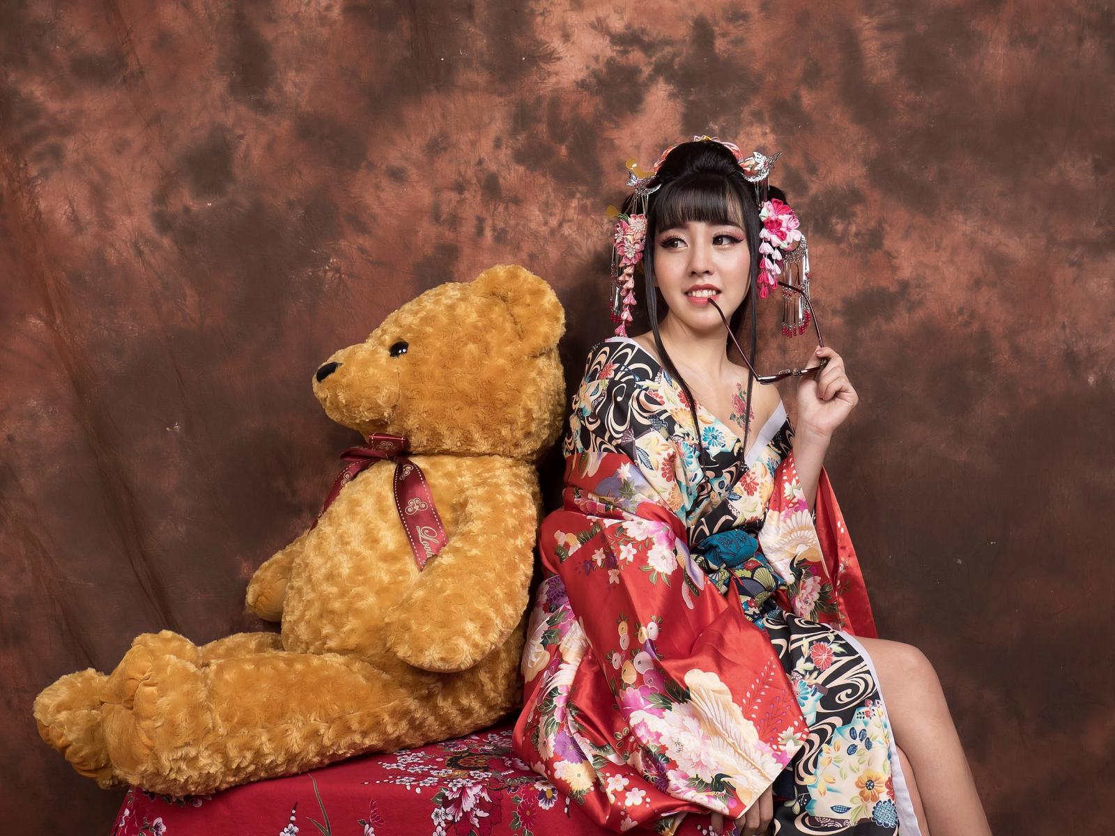 Обои Девушка азиатка сидит с большим плюшевым медведем