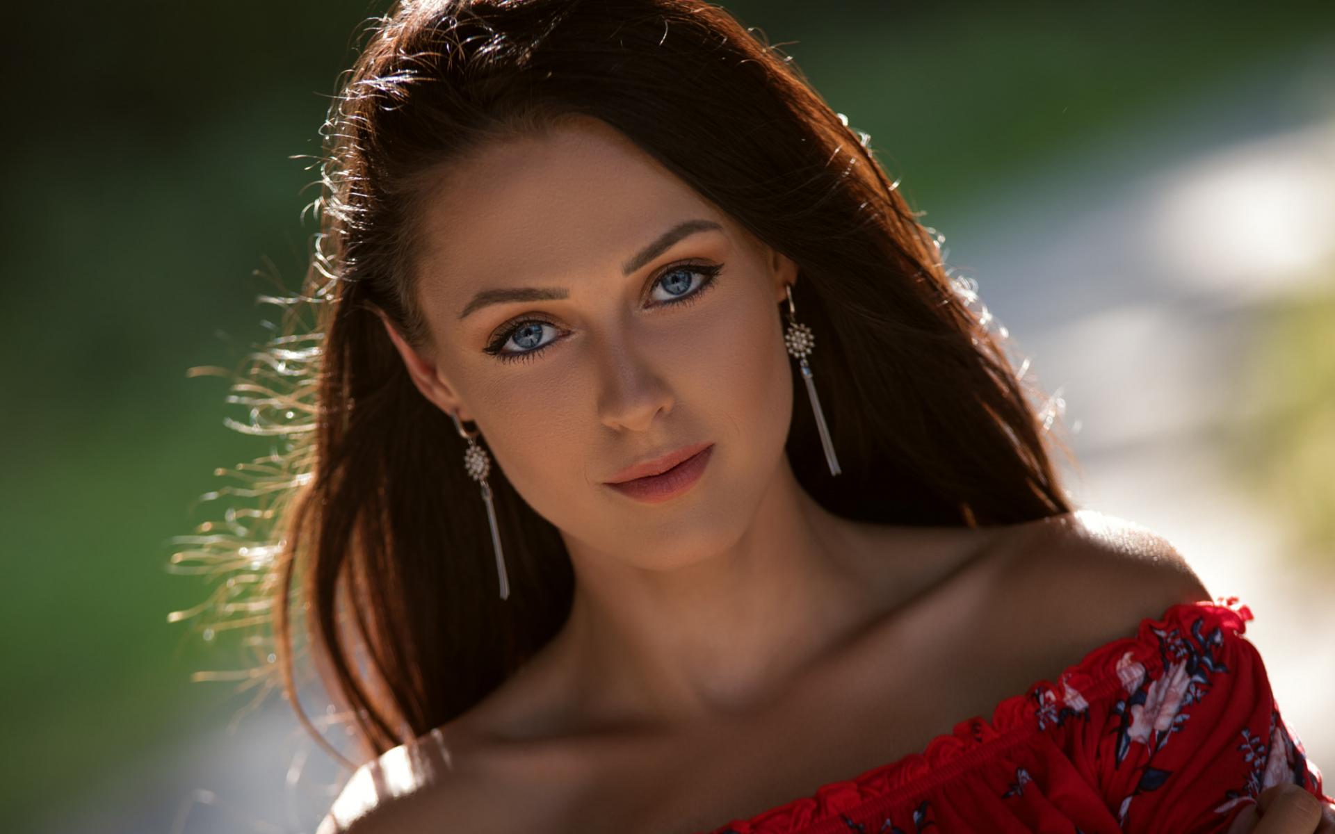 Обои Красивая голубоглазая брюнетка с серьгами у ушах