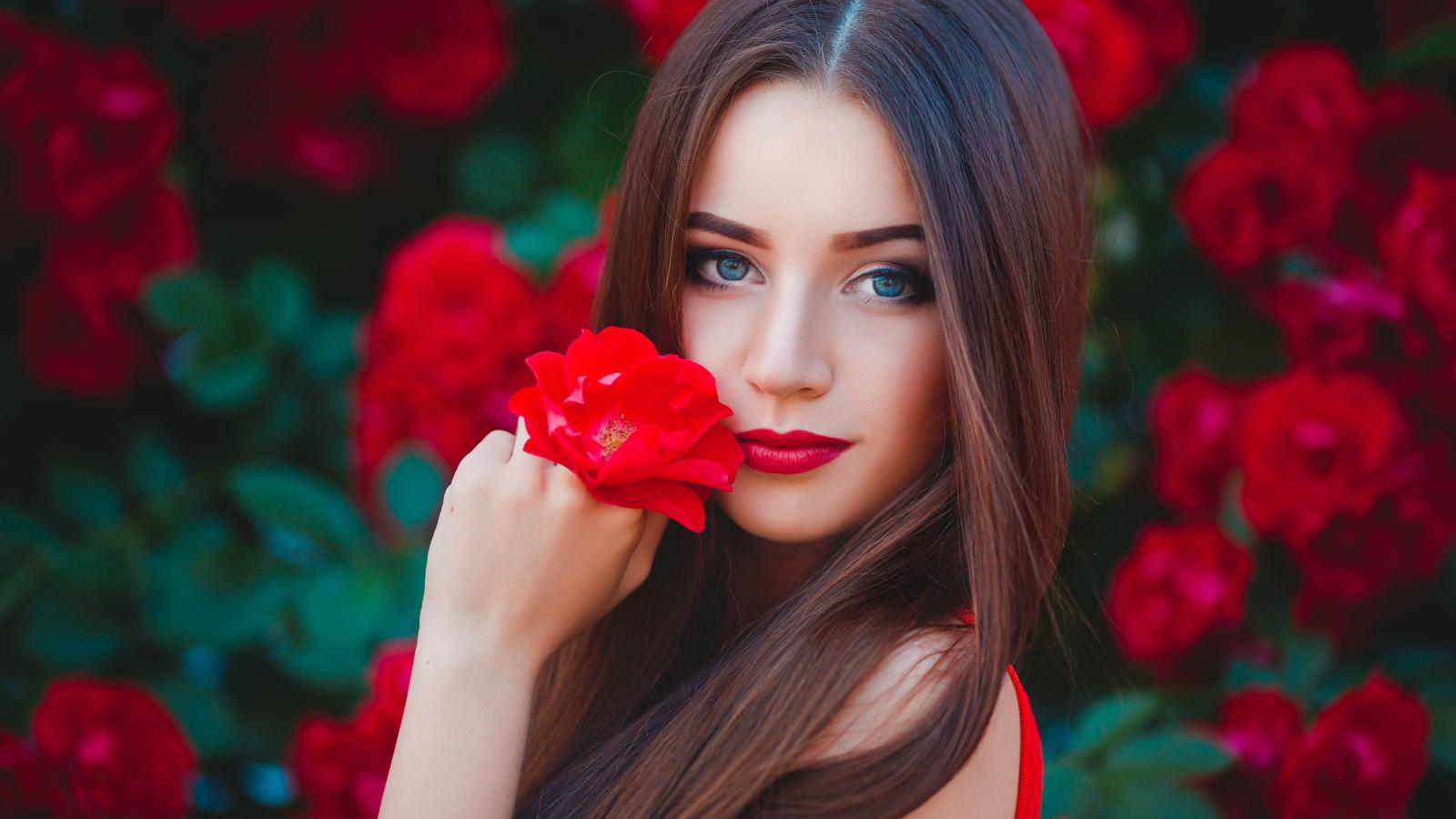 Обои Красивая голубоглазая девушка с красной розой в руке