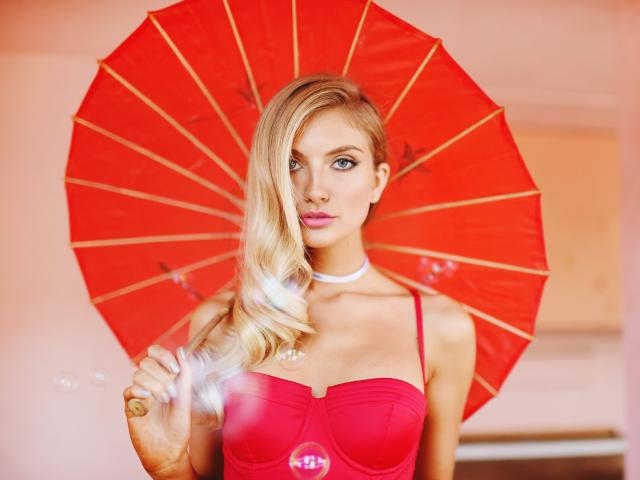 Обои Красивая блондинка с красным зонтом