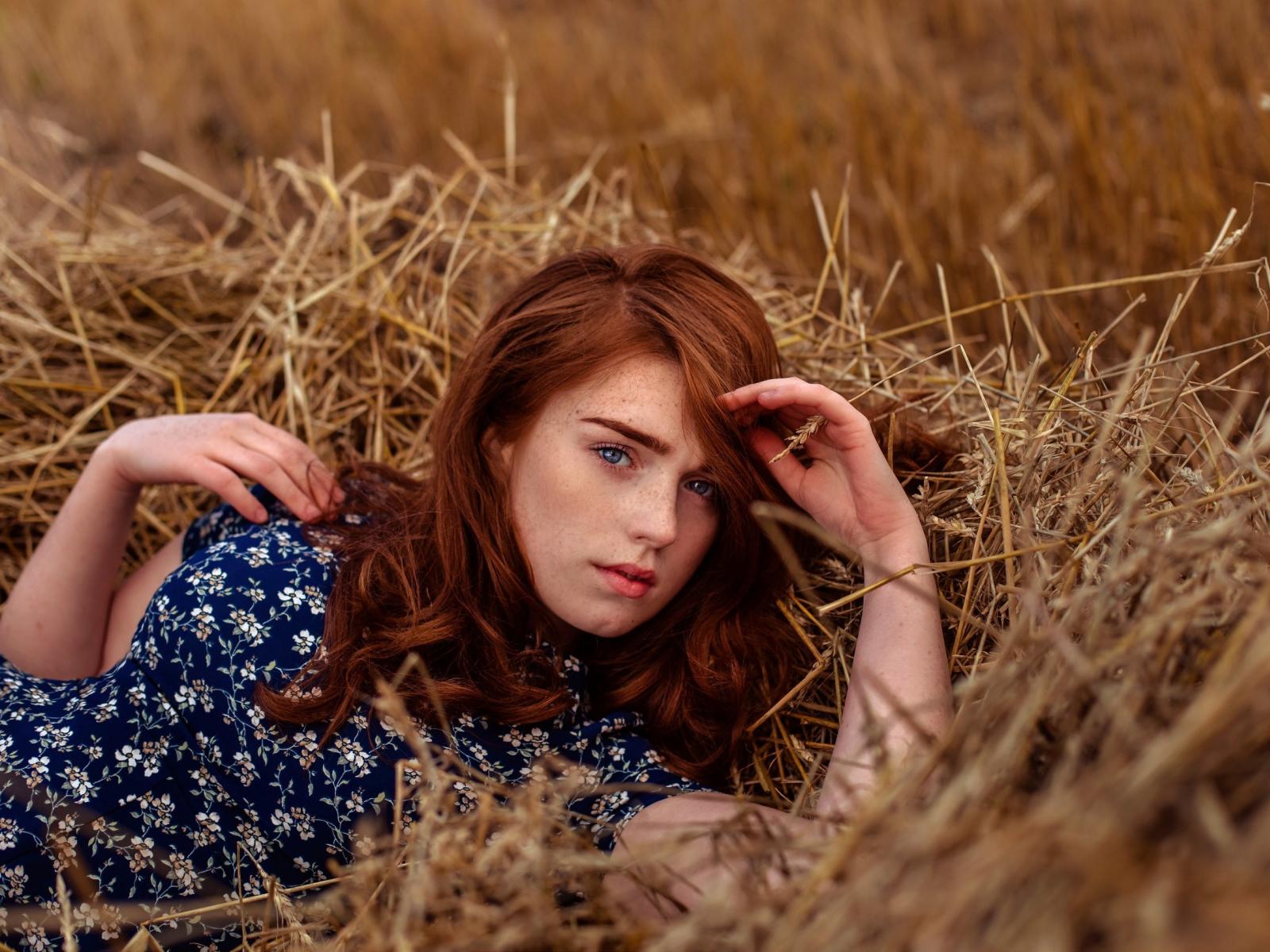 Обои Красивая голубоглазая рыжеволосая девушка лежит в сене