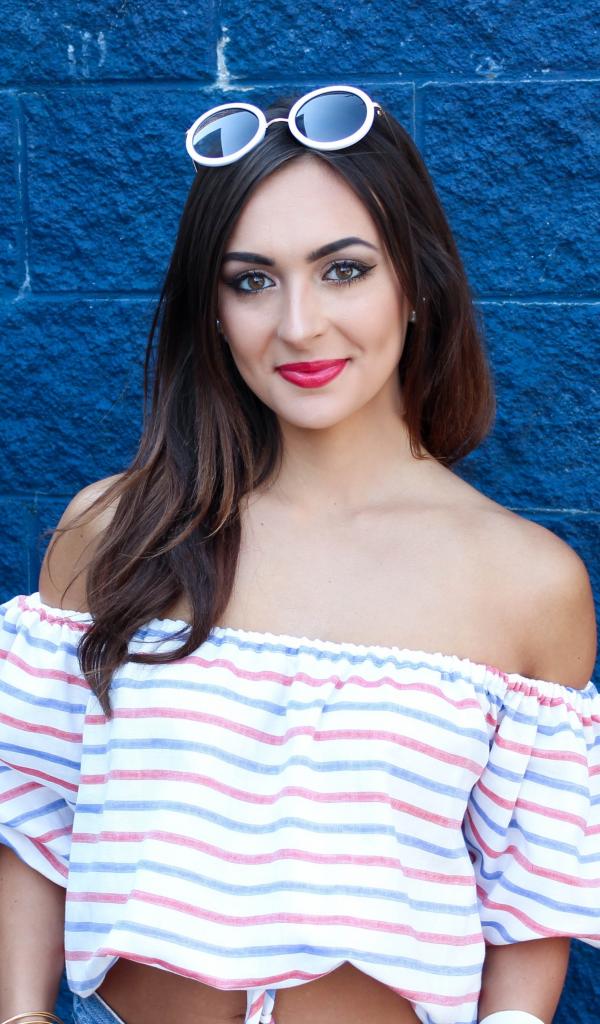 Обои Красивая улыбающаяся девушка на фоне синей стены